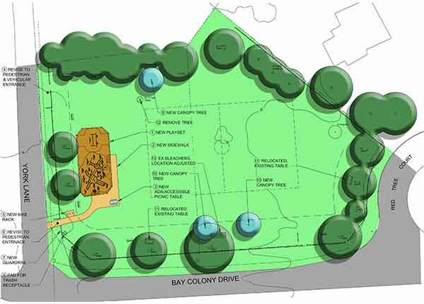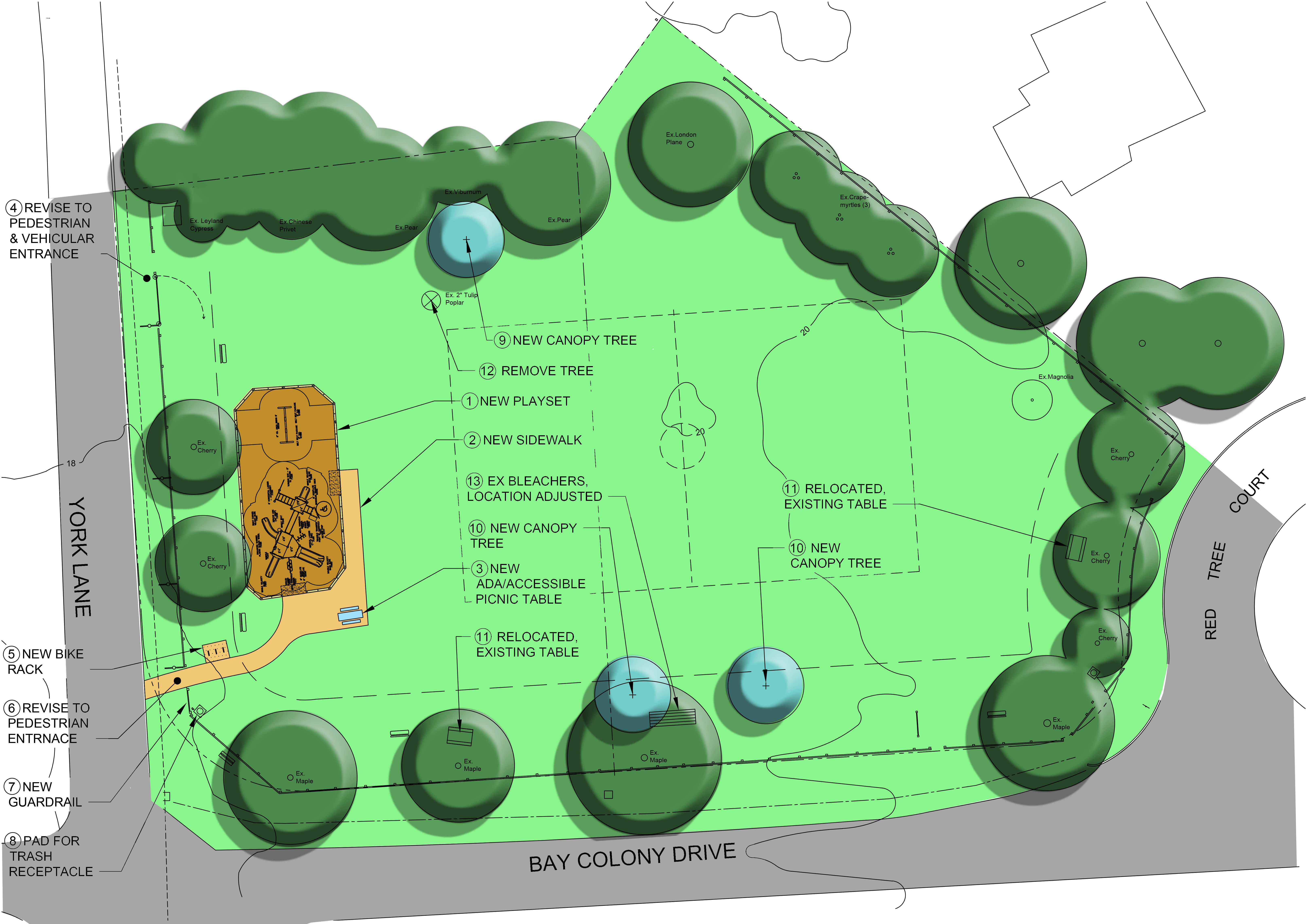 Families will soon enjoy a brand-new, multi-featured playset and swing bay, connected by a smooth ADA-accessible sidewalk from York Lane. To ensure everyone can access the park comfortably, a new ADA-compliant picnic table will be added, along with relocated existing tables placed in shaded areas for extra comfort. Park access is being thoughtfully redesigned with a new pedestrian and vehicle entrance, relocating the maintenance access and adding a swing gate at the northwest corner.